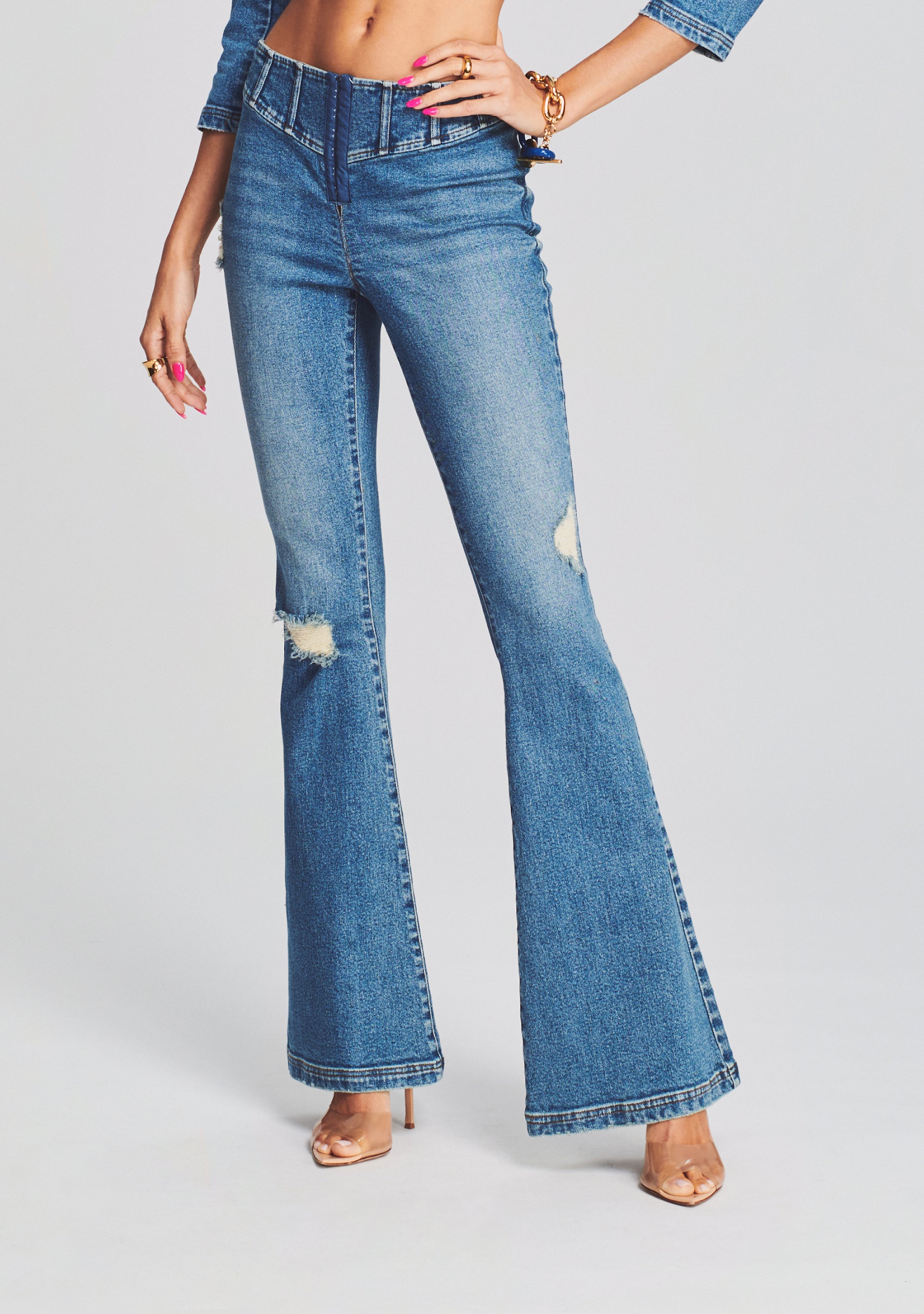 The Estela Jean features a dramatic. exaggerated flare in direct contrast with its snug fit throughout the hips and thigh. What sets it apart is its corset-like detailing at the waist. It's complete with a zip fly and distressing throughout. Shown here in Bailey.