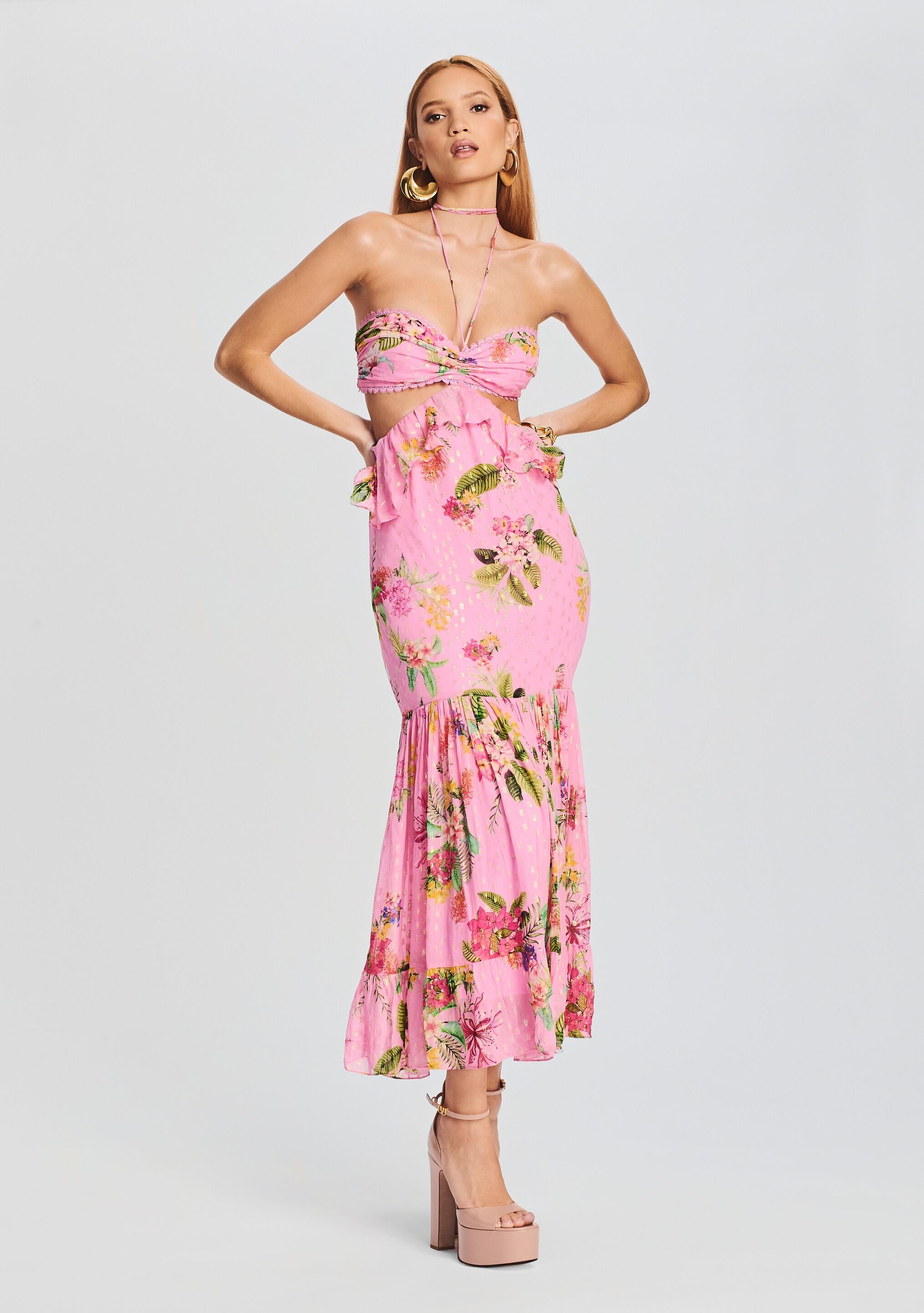 The Rue Long Dress is a striking maxi with just the right amount of attitude. It features a halter neck. horseshoe detail at bust and cutouts at sides. The silhouette is finished with a romantic tiered hem. Shown here in Colorful Floral on Candy Pink.