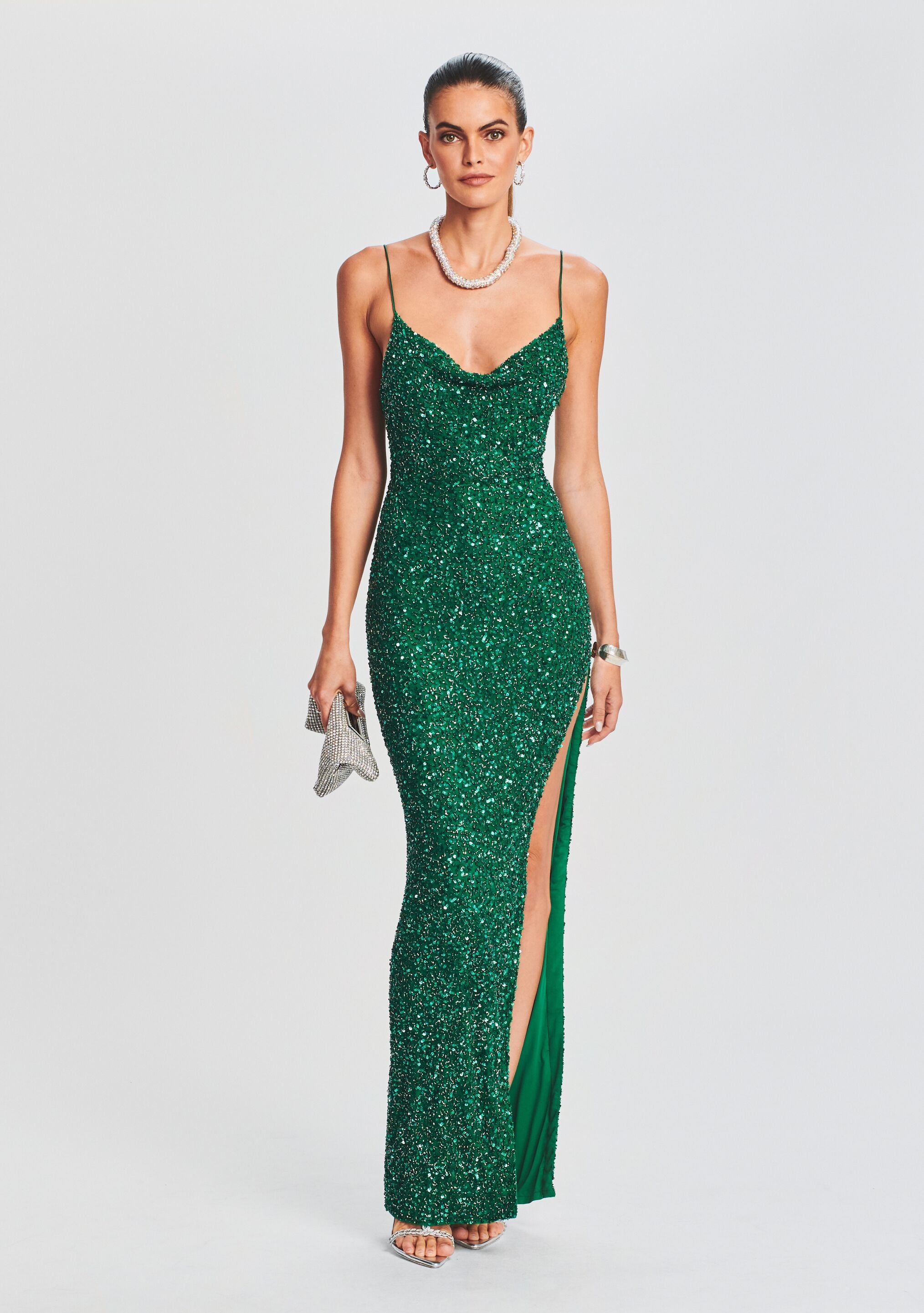 Our Loretta Dress is an incredibly flattering. classic evening dress you'll turn to again and again. This body-skimming style features meticulously embroidered sequins. a cowl neck. spaghetti straps. and a high side slit for added drama. Shown here in Emerald.