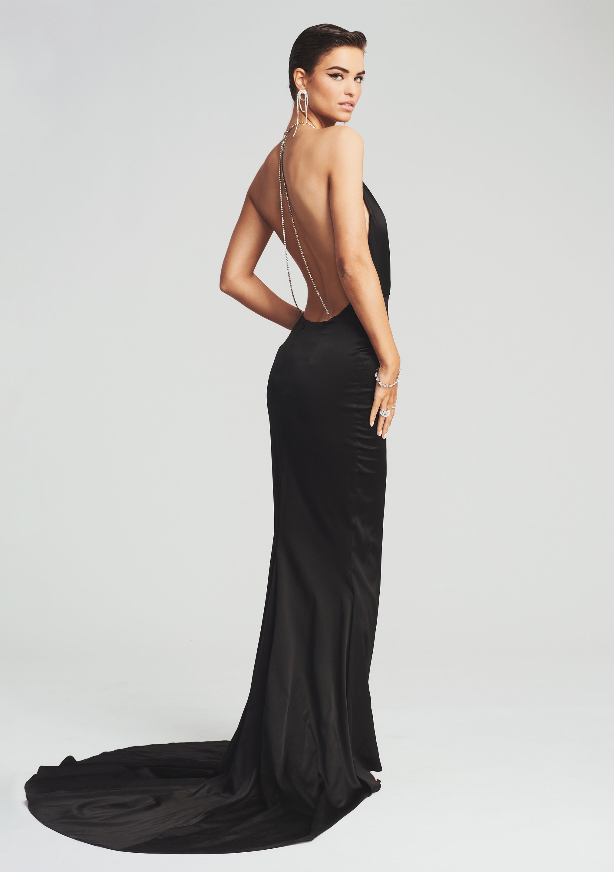 The Margot Dress emits pure elegance. The maxi features a halter neckline and a delicate open back. A subtle train completes the body-hugging look. Shown here in Black.