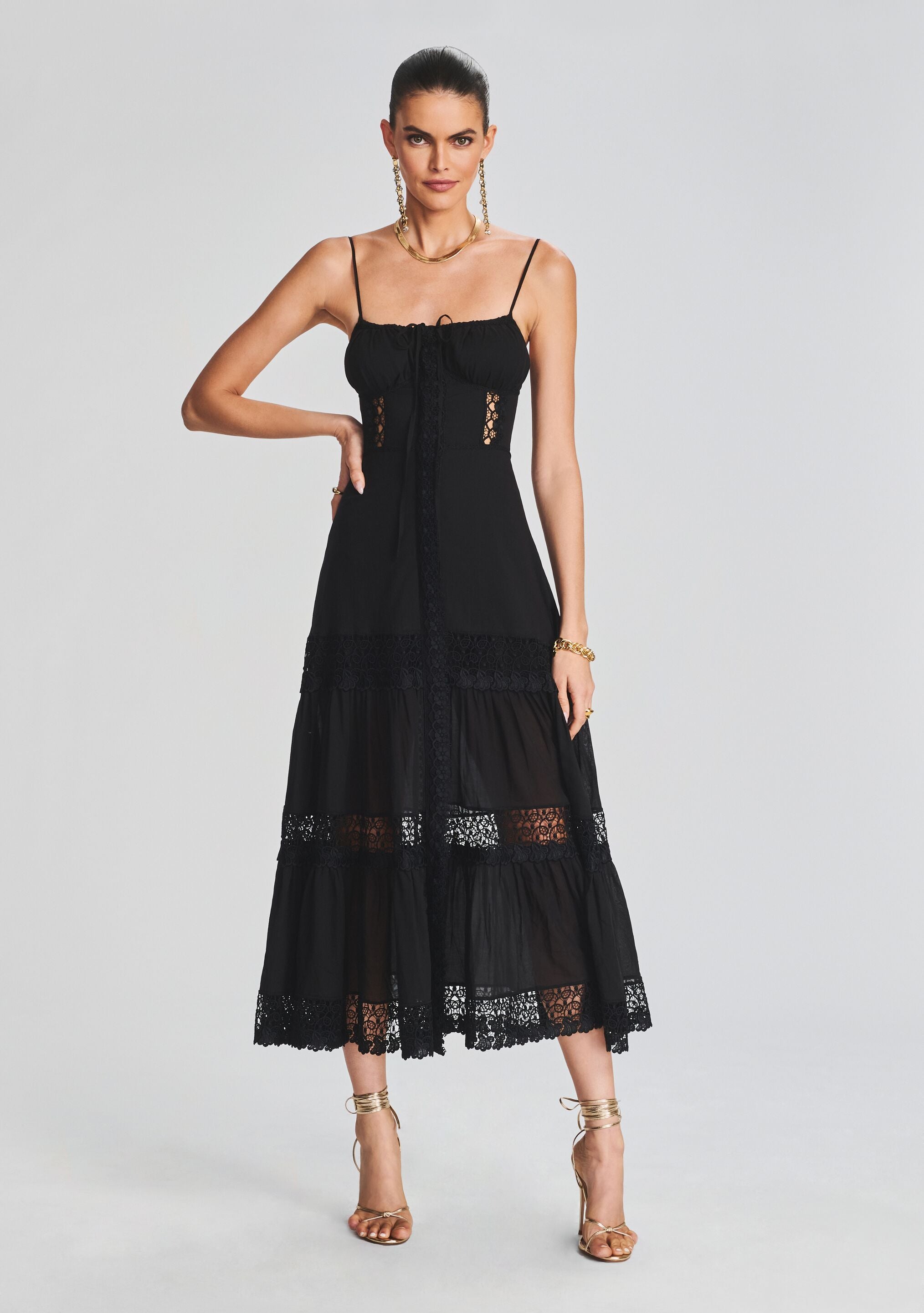 The Marisa Dress is a subtly Glamorous midi style that can easily be worn day or night. This versatile must-have for your next vacation features an adjustable drawstring at the bodice. guipure lace throughout. drop waist. and a tiered skirt. Shown here in Black.