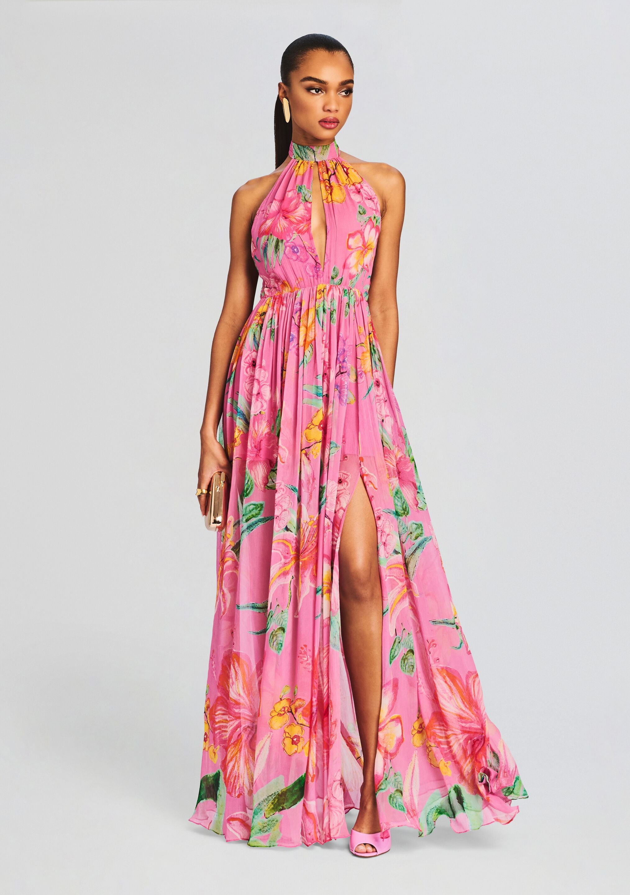 Embody summer chic with Rococo Sand's mesmerizing Megan Long Dress. This flowy maxi dress boasts a delightful tropical print that embodies the essence of paradise. Featuring a stunning keyhole halter neckline that adds a touch of allure and a graceful slit for a hint of sophistication. this dress effortlessly combines style and comfort for the modern fashionista. Shown here in Pink Floral.