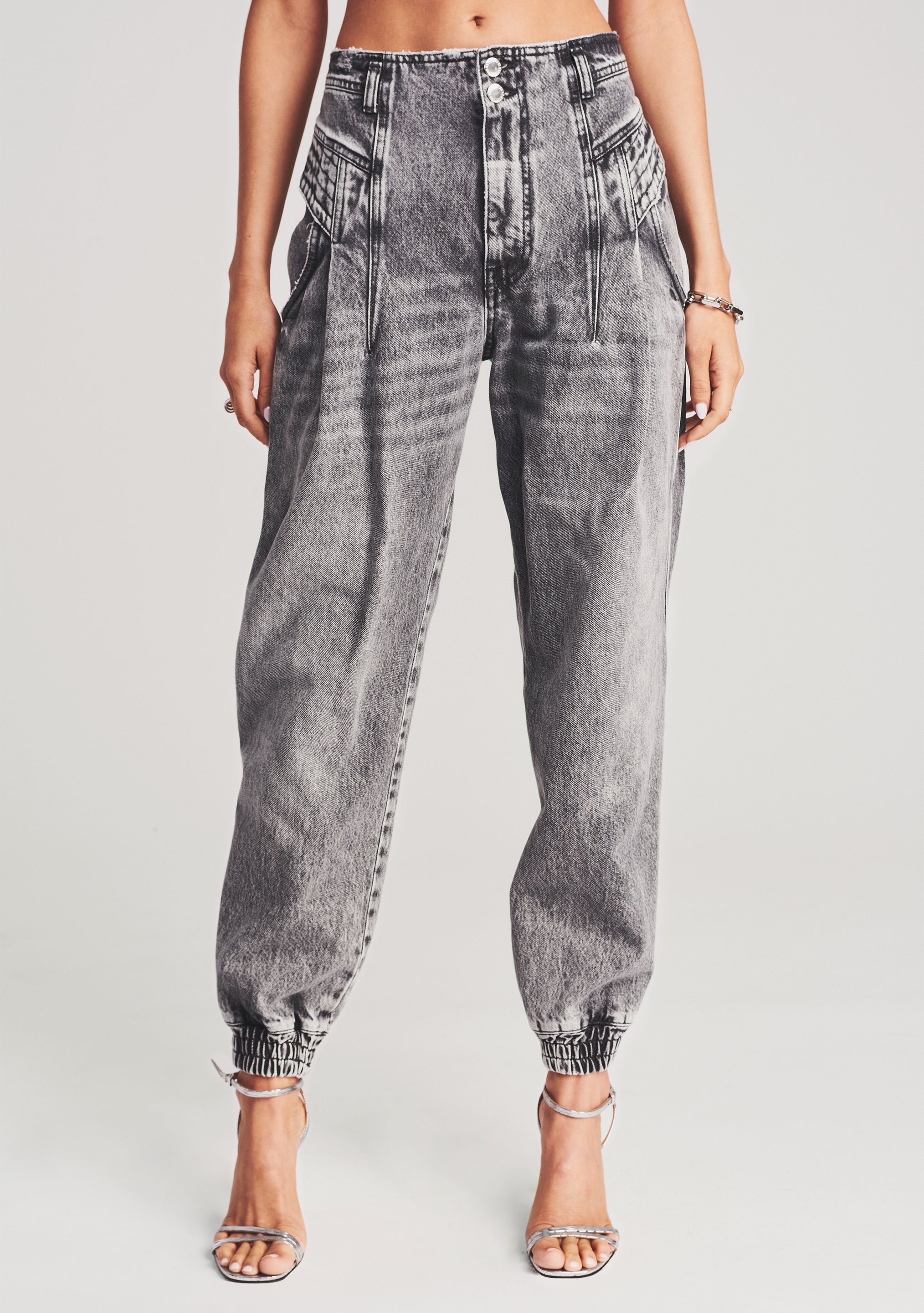 A call to the '80s. the Miriam Pant is a cool alternative to your classic jeans. Designed with billowy tapered legs. the ultra high-waist silhouette is subtly faded and distressed throughout. The style is finished with button accents and topstitched panels at the waist. Wear it with a classic tee or a bodysuit. Shown here in Slate Grey.