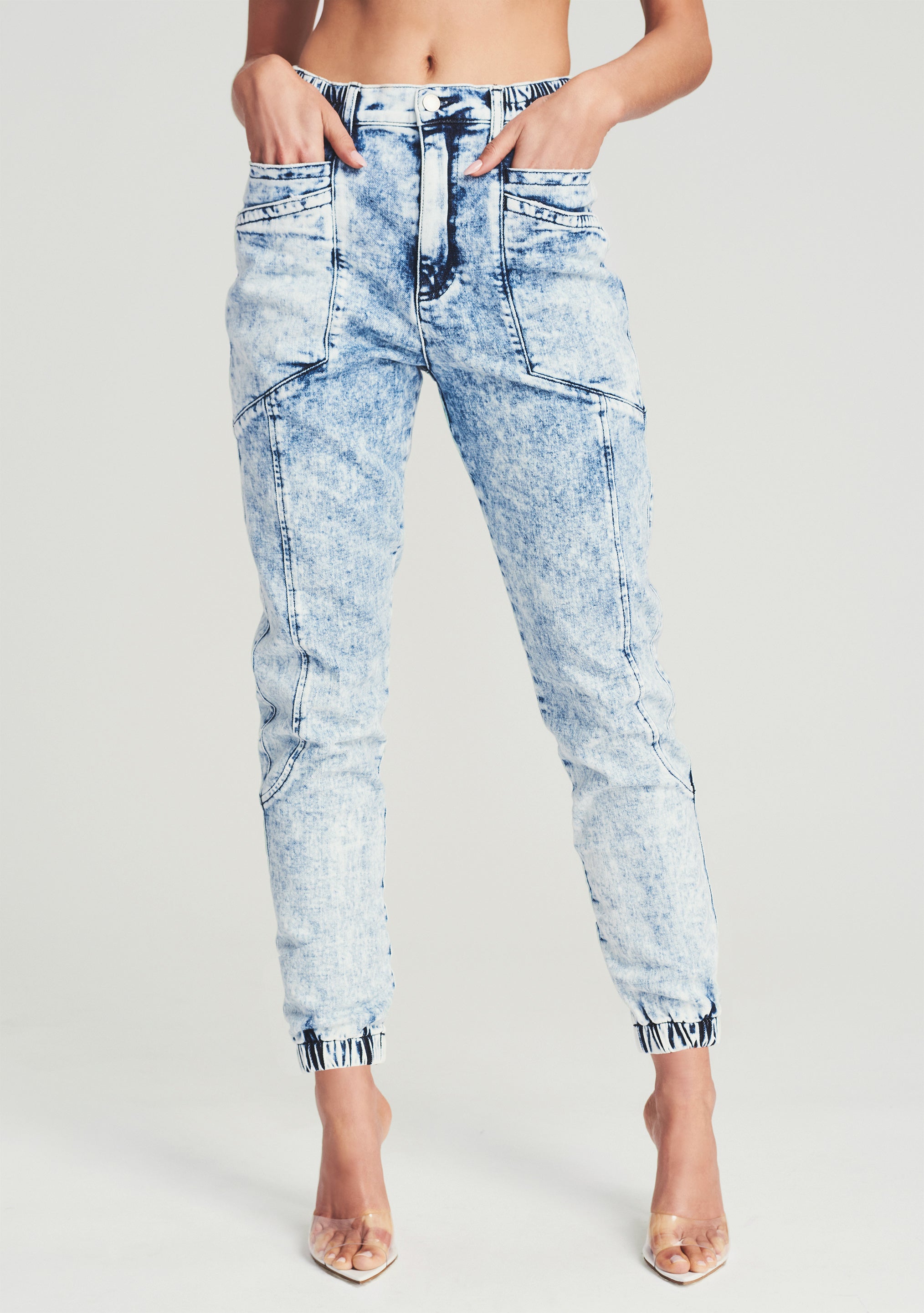 The Myla Pant offers a fresh take on classic joggers. Cut in acid-washed denim. the pant is designed with a gathered elastic waist. elasticized hems and oversized patch pockets. Wear them with a tucked-in tee and sneakers. Shown here in Light Blue Acid.
