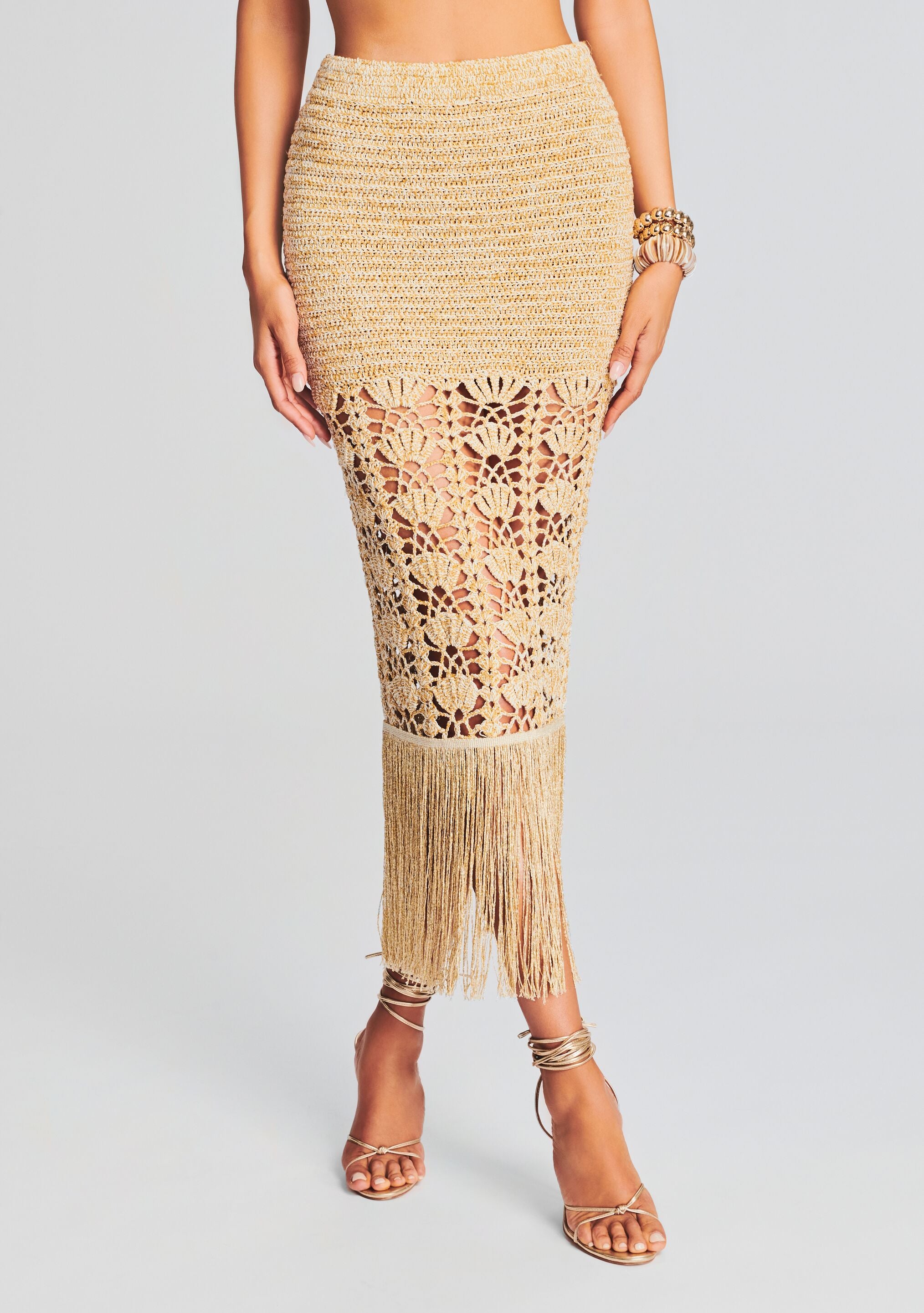 Show off your seaside style in our Naida Skirt. This mermaid silhouette skirt features seashell-patterned cutouts and a fringed hem. Shown here in Gold.